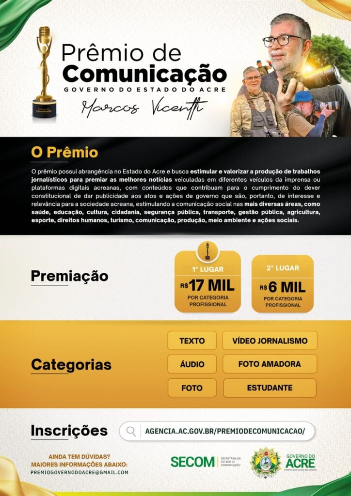 Promovido pela Secretaria de Estado de Comunicação (Secom), o prêmio tem objetivo de estimular e valorizar produções jornalísticas que abordem ações de governo e temas de interesse e relevância para a sociedade acreana, abrangendo diversas áreas, como saúde, educação, cultura, segurança pública e gestão.