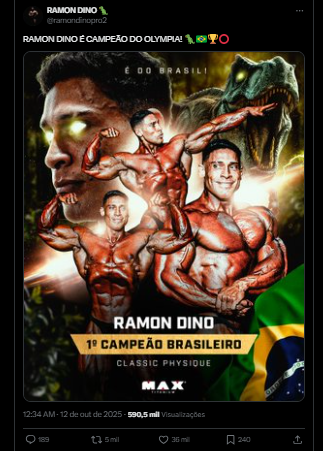 Com o título, Ramon Dino consolida seu nome no fisiculturismo mundial e leva o Brasil ao topo da categoria pela primeira vez. A vitória encerra uma espera de anos e reforça o país como uma das maiores potências do fisiculturismo atual.