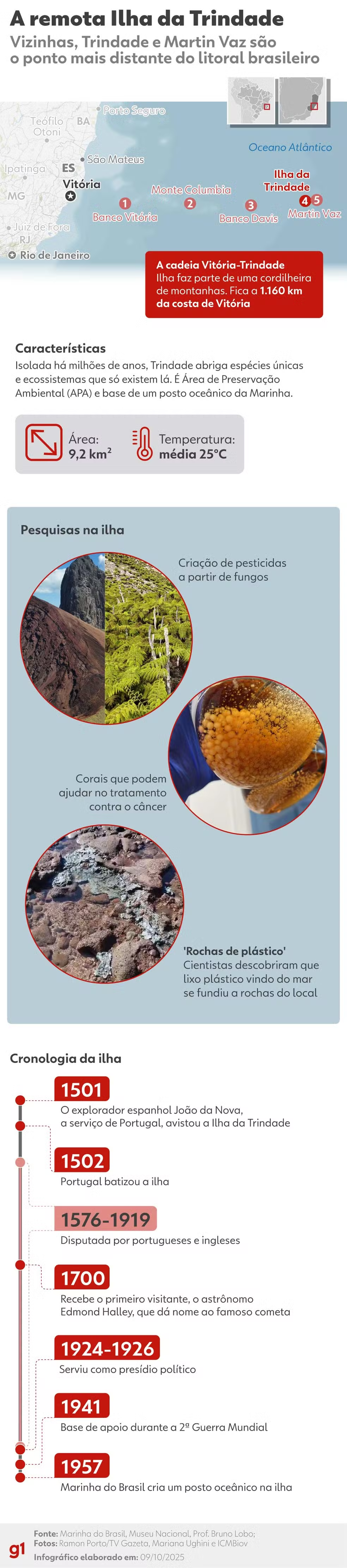 Essa é a quarta reportagem da série especial do g1, "Expedição Trindade". A equipe embarcou em um navio da Marinha até a ilha. Quatro reportagens, de quinta (9) a este domingo (12), mostraram pesquisas inéditas na ilha, entre elas, como corais podem ajudar na luta contra o câncer, samambaias gigantes testadas como pesticidas naturais e a rotina de quem trabalha no arquipélago.