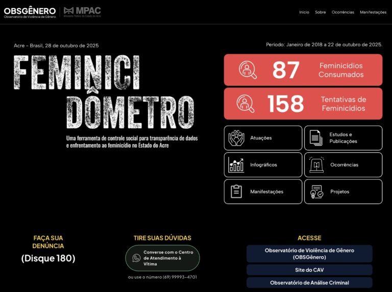De acordo com os dados do observatório de violência de gênero do Ministério Público do Acre, o número de feminicídio consumado, de 2018 a 2025, somam- se 87 e 158 tentativas contra a mulher. Como nos mostra o gráfico: feminicidometro.mpac.mp.br