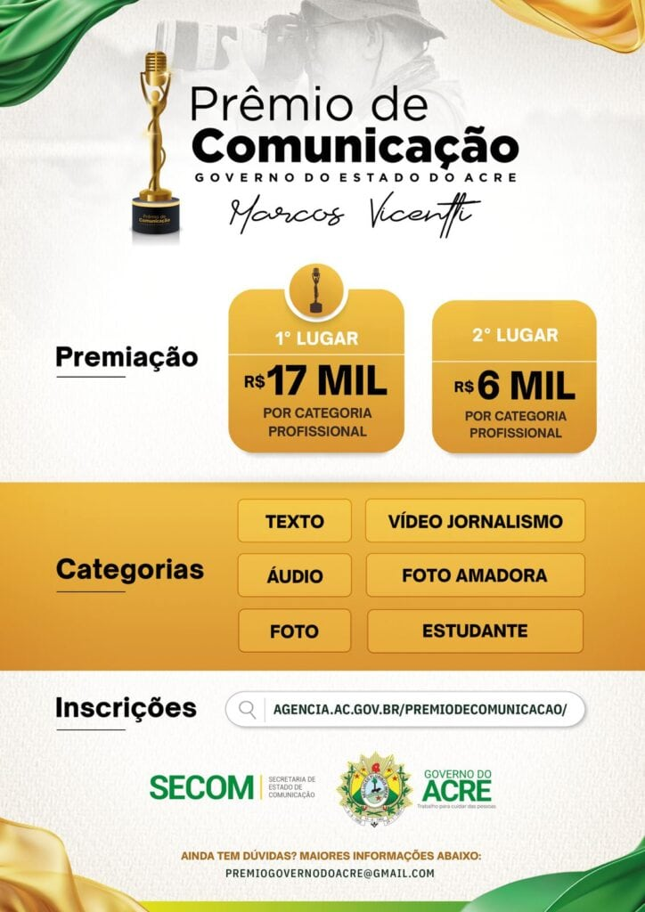 As inscrições para a 3ª edição do Prêmio de Comunicação do Governo do Estado do Acre –Marcos Vicentti podem ser feitas até às 23h59 (horário local) desta sexta-feira, 31. O edital completo com regras e critérios está disponível no link https://agencia.ac.gov.br/wp-content/uploads/2025/05/Regulamento-Premio-de-Comunicacao-Marcos-Vicentti.pdf.
