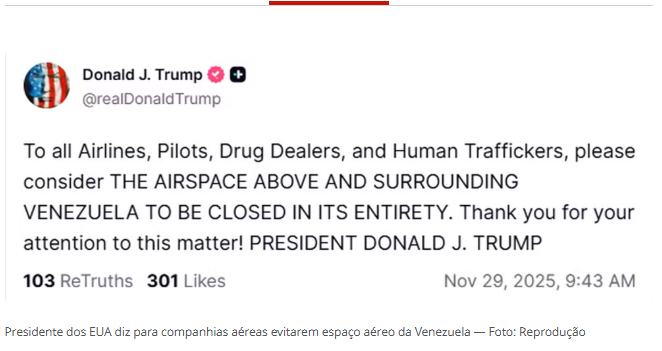 FONTE: https://g1.globo.com/mundo/noticia/2025/11/29/trump-diz-para-companhias-aereas-considerarem-espaco-aereo-da-venezuela-fechado.ghtml